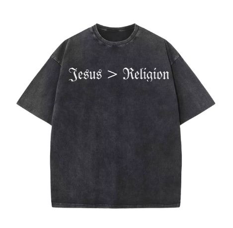 This shirt was created to emphasize the difference between a personal relationship with Jesus and man-made religious systems or empty rituals.